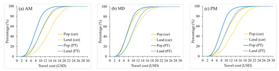 Table 2 shows the two modes’ mean travel costs to the city center and the cost-ratio (Equation (4)). We can find the travel costs of both modes are lower during MD. And the mean cost by automobile is closer to PT during MD but significantly higher than PT during AM and PM since automobile-based cost increases during peak hours. The mean cost-ratio is higher during MD, but it is less than one for all the three time periods, i.e., the mean travel cost by PT is lower than that by automobile during peak and off-peak hours. Measured from the mean travel cost perspective, traveling by PT has better CCA.