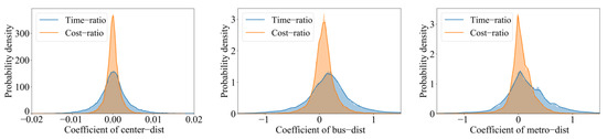 The GWR model with time-ratio as the dependent variable has an adjustedR2 of 0.82 and an AICc of −10,576.64. In the other model with cost-ratio as the dependent variable, the adjustedR2 is 0.81, and the AICc is −90,258.68. It can be seen that the GWR can explain the two models better. The effect of the explanatory variables on the dependent variables in a GWR model is spatially heterogeneous, i.e., the regression coefficient of the explanatory variables varies in different areas. Based on the regression results of the above two GWR models, we draw probability density distributions and positive-negative effects of the regression coefficients for each variable, as shown below (Figure 8 and Table 4). As shown in Figure 8, the coefficient distribution of center-dist shows a relatively standard normal distribution. The bus-dist and metro-dist coefficients show right-skewed patterns, and the right-skewed is more prominent especially when time-ratio is used as the dependent variable. Table 4 shows that center-dist has comparable positive and negative effects on the dependent variables, while bus-dist and metro-dist have mostly positive effects. The farther the unit is from a bus stop or metro station, the larger the time-ratio and cost-ratio may be. Alternatively, PT-based CCA is more likely to be similar or even superior to automobile-based CCA for units near bus stops and subway stations.