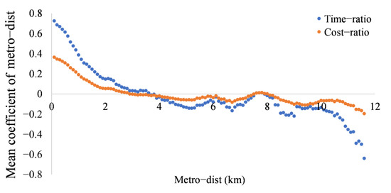 Concerning the scope of effects, we counted the correlation coefficients of the units within the same distance range from metro stations. For units with the same range of metro-dist (100 m interval), their mean correlation coefficients of metro-dist are calculated, as shown in Figure 10. We can find that when time-ratio and cost-ratio are used as the dependent variables, the correlation coefficient decreases with increasing metro-dist, and the closer the distance to metro stations, the stronger the positive correlation. In which, when time-ratio is the dependent variable, the mean value of the correlation coefficient drops below zero when metro-dist exceeds 3.6 km. In other words, the positive effect of metro-dist on time-ratio is mainly concentrated in the area within 3.6 km of metro stations. Although some areas have negative effects within this scope, the positive effect is dominant overall. The corresponding distance is 2.8 km when cost-ratio is the dependent variable, i.e., the mean value of the correlation coefficient drops below zero when metro-dist exceeds 2.8 km.