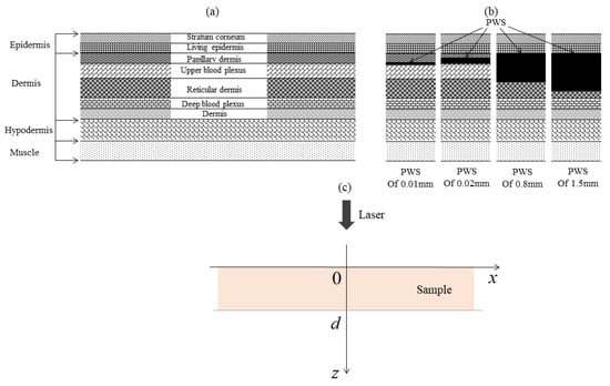 Based on the anatomical and structural properties of skin tissue lesions, this paper constructs a nonlinear photothermal detection model for PWS, as shown in Figure 1c. Based on the optical attenuation, imaging depth, and other information reported by Chen et al., a laser pulse with a wavelength of 840 nm was chosen for PWS detection in this study. The parameters of each skin layer at a wavelength of 840 nm are shown in Table 1 [,,,].