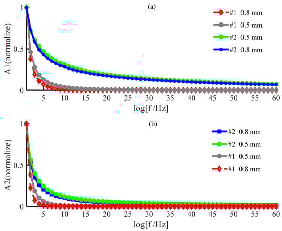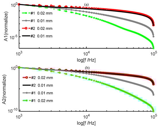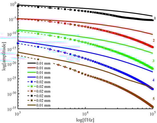 The amplitude of the signal from the posterior surface of PWS samples of different thicknesses obtained by the two numerical methods decreases with increasing frequency in the low−frequency and high−frequency ranges as shown in Figure 2 and Figure 3, respectively. In the low−frequency range, Figure 2 shows that the amplitude of each order harmonic of the signal from the posterior surface of the PWS samples obtained by both numerical methods decreases with increasing frequency when other parameters are constant and the sample thicknesses are mm and mm. In the high−frequency range, Figure 3 reveals that the amplitude of each order harmonic of the signal from the posterior surface of the PWS samples obtained by both numerical methods decreases with increasing frequency when other parameters are constant and the thickness of the samples is mm and mm.