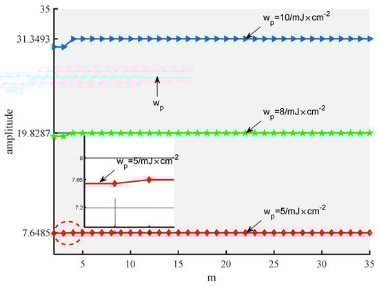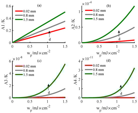 Figure 5 shows the variation of each order of harmonics with light energy on the posterior surface of the PWS samples at different thicknesses obtained with the new method. Figure 5 shows that the amplitude of each order of harmonics increases with increasing light energy when other parameters are constant. Additionally, when other parameters are constant, the amplitude of each order of harmonic decreases with increasing thickness. As observed from Figure 5a, the fundamental frequency amplitude is proportional to the optical energy , which is consistent with the results of linear theory. As observed from Figure 5b,c, the amplitudes of the higher−order harmonics are proportional to the square of the light energy, which is consistent with the theoretical derivation.
