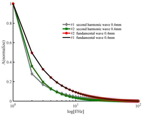 The effectiveness of the new iterative numerical method for solving the nonlinear heat diffusion equation is demonstrated in Figure 6 and Figure 7. Numerical simulations of the nonlinear heat diffusion equation for the 2219 aluminum alloy sample using the new numerical iterative method show two effects. First, the amplitude of each order of harmonics decreases with increasing frequency. Second, the second−order harmonic amplitude decreases with increasing thickness. The above conclusions are consistent with those obtained by the conventional perturbation method, and Figure 6 shows that the fundamental frequency wave results obtained by the two methods are very consistent. Therefore, the effectiveness of the method is demonstrated in Figure 6 and Figure 7.