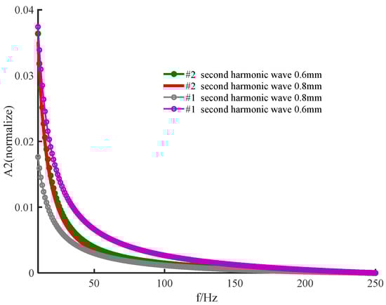 Figure 4 shows the variation in the amplitude of each order of harmonics the frequency on the posterior surface of PWS samples at different thicknesses obtained by the new method. From Figure 4, the following conclusion can be drawnwhile other parameters held constant. First, each order of harmonic decreases with increasing frequency. Second, each order of harmonic decreases with increasing thickness. Third, the rate of change with thickness is larger for higher−order harmonics than lower−order harmonics, indicating that the effects of higher−order harmonics are more sensitive to the change in the sample thickness than those of the lower−order harmonics. Therefore, it is necessary to consider higher−order harmonics. In addition, the difference between the rates of change of the fourth and fifth harmonics with thickness is not very obvious. Therefore, the choice is appropriate in the theoretical derivation.