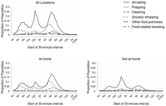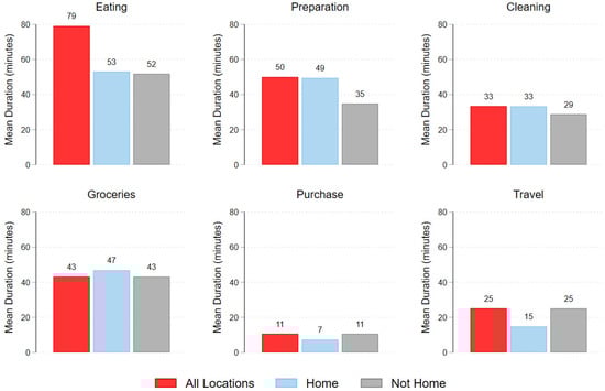 | Duration | Duration of all food-related activities as (1) total time spent; (2) a percentage of the day; and (3) a percentage of all food-related activities |