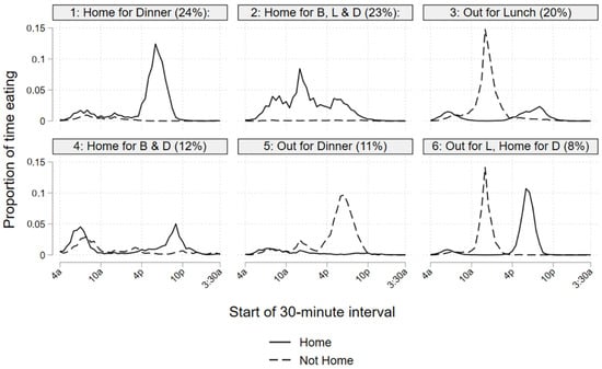 | Variable | Category | Sample 1 | (1) Home Dinner | (2) Home B, L and D | (3) Out to Lunch | (4) Home B and D | (5) Out to Dinner | (6) Out L, Home D |