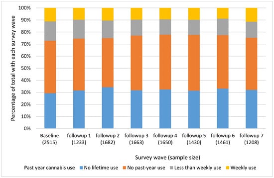 Self-reported cannabis use frequency across VACS survey waves. Notes: Numbers underneath the survey wave indicate the number of participants who completed each survey wave (e.g., 2515 participants were identified at the baseline assessment).