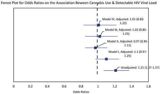 Unadjusted analyses for overall association with detectable viral load. In unadjusted analyses, PWH with any past-year cannabis use had 21% greater odds of a detectable virus than those with no past-year use (OR = 1.21; 95% CI, 1.07–1.37) (Table 2, Figure 2).
