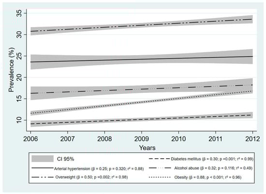 The prevalence rate was used to describe the epidemiological data. Prais–Winsten regression analysis was used to determine the temporal behavior of risk factors of stroke between 2006 and 2012, stratified by age group and geographic regions of Brazil. For the analysis of temporal trends, the methodological indications proposed by Antunes et al. were used []. The construction of the time series was calculated using Prais–Winsten regression, which allowed first-order autocorrelation corrections to be performed on values organized by time. Thus, the following data were estimated: the angular coefficient (β), probability value (p), and predictive capacity (r2) of the model.