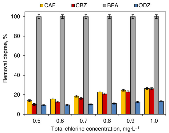 Influence of total chlorine concentration on the removal degree of CECs (dark chamber experiment, n = 3 where CAF—caffeine, CBZ—carbamazepine, BPA—bisphenol A, ODZ—oxadiazon).