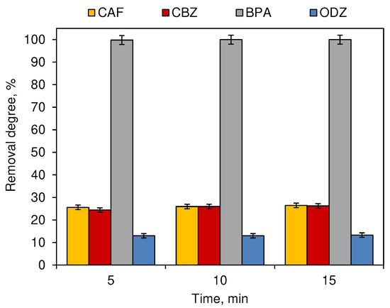 Figure 4 presents the changes in the compound concertation subjected to 2.0 mg·L−1 of O3 after 5, 10 and 15 min of process time. The removal degrees of CAF and ODZ observed at all time periods were similar. Only the concentration of BPA decreased with the increase of the processing time and ranged from 45% noted after 5 min of ozonation to 55% after 15 min. For BPA, the influence of ozonation time was significant for the results of removal efficiency (p < 0.05). For other compounds, it was not significant (p ≥ 0.05).