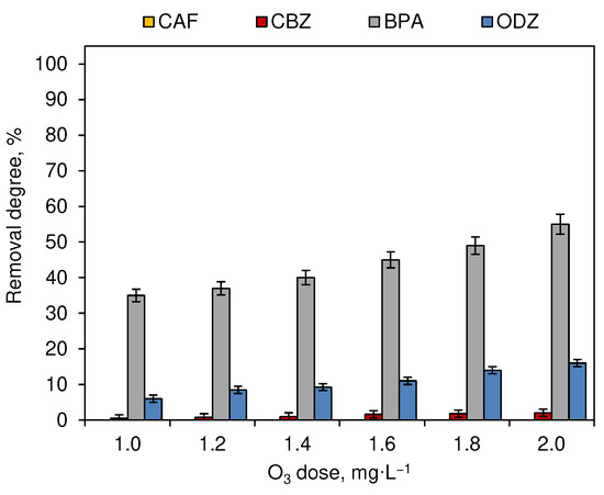 Influence of O3 dose on the removal degree of CECs (dark chamber experiment; n = 3; where CAF—caffeine, CBZ—carbamazepine, BPA—bisphenol A, ODZ—oxadiazon).