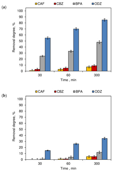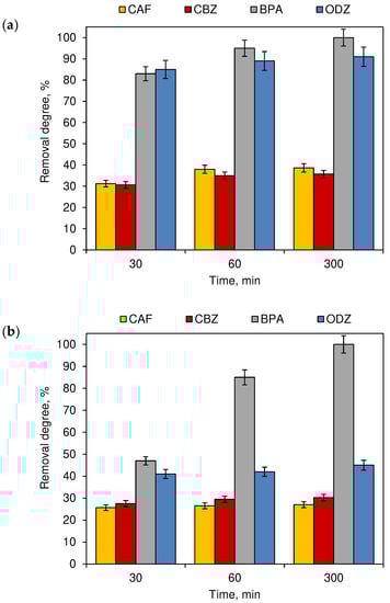 The removal degree of CECs tap water mixtures exposed to (a) sunlight (outdoor swimming pool) and (b) artificial lighting (indoor swimming pool) (n = 3; where CAF—caffeine, CBZ—carbamazepine, BPA—bisphenol A, ODZ—oxadiazon).
