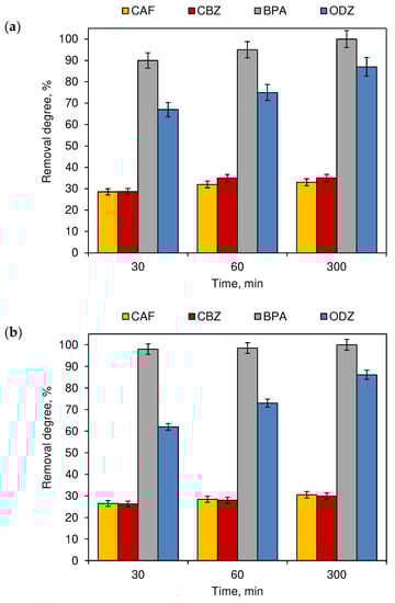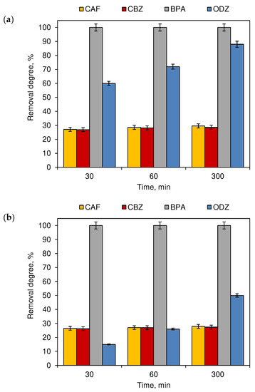 This dependency changed when chlorinated water was exposed to sunlight (Figure 6a) or artificial light (Figure 6b). For both, sunlight and artificial light, the duration of the process was significant only for the removal degree of ODZ (Figure 6). Among the tested four compounds, ODZ was the least susceptible to decomposition under the influence of reactive chlorine species (Figure 1). In the case of combining the chlorination and photodegradation processes (Figure 6), the degradation efficiency of this compound increased significantly over time.