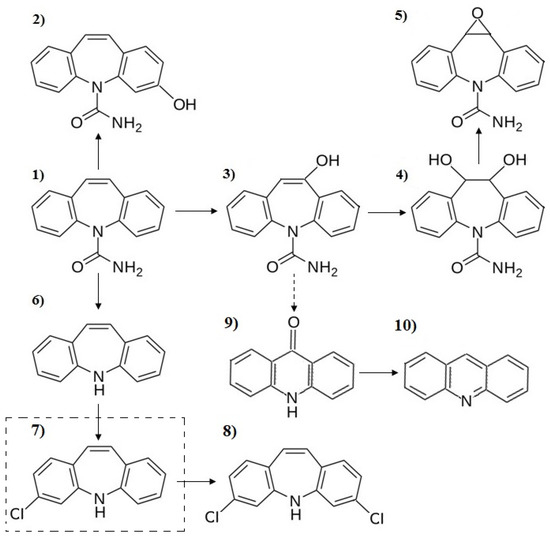 (1) CBZ decomposition by-products: (2) 3-Hydroxycarbamazepine, (3) 10,11-Dihydro-10-hydroxycarbamazepine, (4) Dihydrocarbamazepine-10,11-trans-diol, (5) Carbamazepine-10,11-epoxide, (6) Iminostilbene, (7) MW = 227 3-Chloro-5H-dibenz[b,f]azepine, (8) 3,7-dichloro-5h-dibenz[b,f]azepine, (9) 9-Acridone and (10) Acridine.