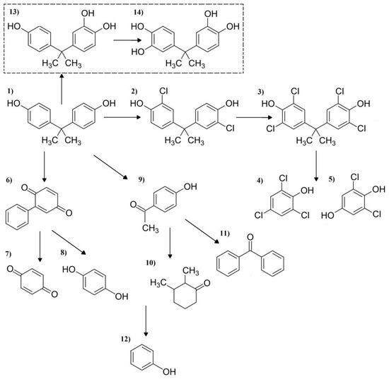 (1) BPA decomposition by-products: (2) 3,3′-Dichlorobisphenol A, (3) Tetrachlorobisphenol A, (4) 2,4,6-Trichlorophenol, (5) 2,6-Dichlorohydroquinone, (6) 2-Phenylbenzoquinone, (7) Benzoquinone, (8) Hydroquinone, (9) p-Hydroxyacetophenone, (10) 2,3-Dimethylcyclohexanon, (11) Benzophenone, (12) Phenol, (13) MW = 244 5-Hydroxybisphenol and (14) MW = 262 5,5′-Dihydroxybisphenol.