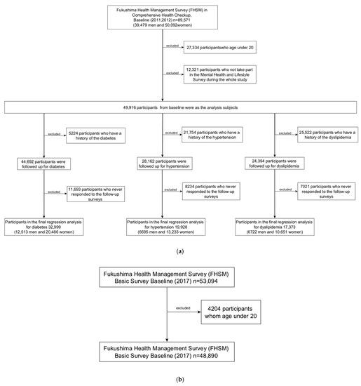 - Satoh, H.; Ohira, T.; Nagai, M.; Hosoya, M.; Sakai, A.; Yasumura, S.; Ohtsuru, A.; Kawasaki, Y.; Suzuki, H.; Takahashi, A.; et al. Evacuation is a risk factor for diabetes development among evacuees of the Great East Japan earthquake: A 4-year follow-up of the Fukushima Health Management Survey. Diabetes Metab. 2019, 45, 312–315. [Google Scholar] [CrossRef] [PubMed]