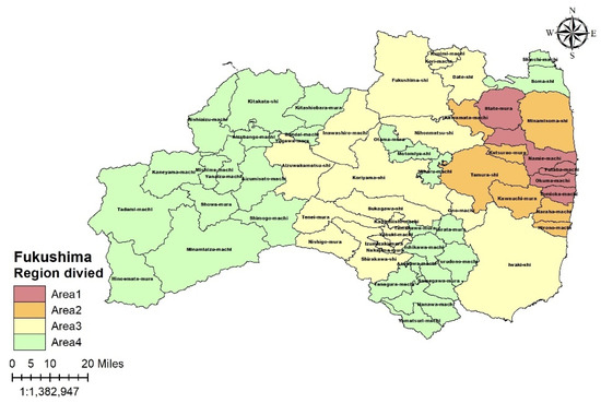 Figure 2 shows the changes in the evacuation areas in the Fukushima Prefecture in 2017, based on the information provided by the national and local governments [14,17]. As of 2017, areas that still have restrictions were labeled as Area1 (red color); those that have lifted restrictions, Area 2 (orange color); those with a history of voluntary refuge [17], Area 3 (yellow color); and those outside of the Fukushima Prefecture, Area 4 (green color).