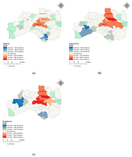 Hot spot analysis of spatial prevalence of lifestyle-related diseases among survey participants: (a) Spatial pattern of diabetes; (b) Spatial pattern of hypertension; (c) Spatial pattern of dyslipidemia.