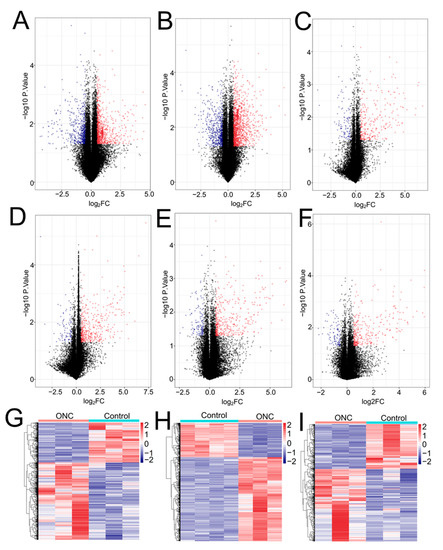 The distribution of differentially expressed genes was manifested by a volcano plot for GSE49371 and GSE49048 datasets, while a heatmap was generated for GSE55228, GSE120257 and GSE131486 datasets with the ‘pheatmap’ package (v1.0.8; https://cran.r-project.org/web/packages/pheatmap, accessed on 3 July 2021). Venn diagram (http://bioinformatics.psb.ugent.be/webtools/Venn/, accessed on 5 July 2021) was applied to illustrate the overlapped genes between genes induced by NPs and ONC models. The expression differences of crucial genes in the retina were validated between hypoxia/H2O2 models and controls by a direct t-test with the SPSS software or online GEO2R provided by NCBI. Data management system BioMart (http://asia.ensembl.org/biomart/martview/59b47575be5aaf1f82c976009a472b38, accessed on 5 July 2021) was used to re-annotate differentially expressed RNAs to distinguish differentially expressed long non-coding RNAs (DE-lncRNAs) and protein-coding messenger RNAs (DE-mRNAs) from other RNA types.