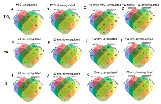 Venn diagrams to show the overlapped genes between NP exposure and ONC treatment. (A) overlapped upregulated genes between PTC TiO2 NPs of GSE49048 and GSE55228-GSE120257-GSE131486; (B) downregulated upregulated genes between PTC TiO2 NPs of GSE49048 and GSE55228-GSE120257-GSE131486; (C) overlapped upregulated genes between 10PTC TiO2 NPs of GSE49048 and GSE55228-GSE120257-GSE131486; (D) overlapped downregulated genes between 10PTC TiO2 NPs of GSE49048 and GSE55228-GSE120257-GSE131486; (E) overlapped upregulated genes between Au20 NPs of GSE49371 and GSE55228-GSE120257-GSE131486; (F) overlapped downregulated genes between Au20 NPs of GSE49371 and GSE55228-GSE120257-GSE131486; (G) overlapped upregulated genes between Au100 NPs of GSE49371 and GSE55228-GSE120257-GSE131486; (H) overlapped downregulated genes between Au100 NPs of GSE49371 and GSE55228-GSE120257-GSE131486; (I) overlapped upregulated genes between Si20 NPs of GSE49371 and GSE55228-GSE120257-GSE131486; (J) overlapped downregulated genes between Si20 NPs of GSE49371 and GSE55228-GSE120257-GSE131486; (K) overlapped upregulated genes between Si100 NPs of GSE49371 and GSE55228-GSE120257-GSE131486; (L) overlapped downregulated genes between Si100 NPs of GSE49371 and GSE55228-GSE120257-GSE131486. PTC: presumptive therapeutic concentration; NPs: nanoparticles; Ag: silver; Au: gold; Si: silicate.