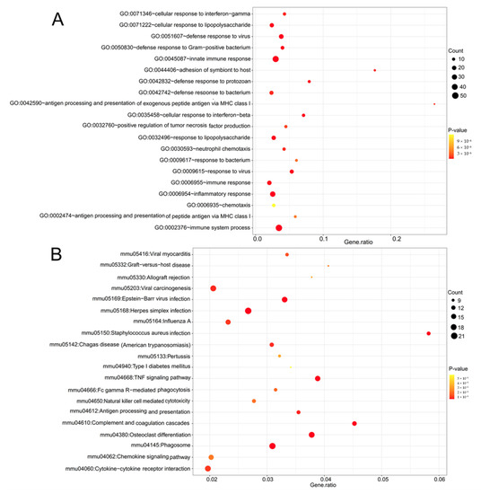 Gene Ontology (GO) and Kyoto Encyclopedia of Genes and Genomes (KEGG) pathway enrichment analyses were performed to investigate the potential functions of DE-mRNAs using the Database for Annotation, Visualization, and Integrated Discovery (DAVID) online tool (v6.8; http://david.abcc.ncifcrf.gov, accessed on 8 July 2021) [28]. p-value < 0.05 was set as the cut-off value.