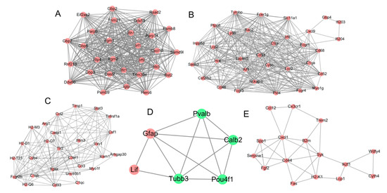 Modules extracted from the protein–protein interaction network. (A) module 1; (B) module 2; (C) module 3; (D) module 4; (E) module 5. Red, upregulated genes; green, downregulated genes.