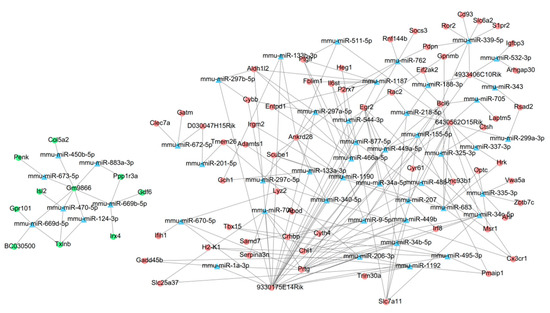 LncRNAs were reported to function as ceRNAs to competitively bind with microRNAs (miRNAs) and then influence the negative regulatory roles of miRNAs on the expressions of targeted mRNAs [33]. To screen crucial DE-lncRNAs and reveal their functions, a ceRNA network was constructed based on the interaction pairs of lncRNAs-miRNAs and miRNAs-mRNAs. DIANA-LncBase (v2.0; http://carolina.imis.athena-innovation.gr/diana_tools/web/index.php?r=lncbasev2/index-predicted, accessed on 16 July 2021) [34] and starbase (v3.0; http://starbase.sysu.edu.cn, accessed on 16 July 2021) databases were used to predict the interacted miRNAs for DE-lncRNAs. miRwalk database (v2.0; http://www.zmf.umm.uni-heidelberg.de/apps/zmf/mirwalk2, accessed on 16 July 2021) that contained 12 prediction programs [35] was used to predict the target mRNAs regulated by DE-lncRNA-interacted miRNAs. Only the miRNA-target gene interaction pairs that were predicted by more than 8 prediction programs were selected. Additionally, target mRNAs were subsequently overlapped with DE-mRNAs. The expression direction of DE-lncRNAs and DE-mRNAs that interacted with miRNAs should be consistent (that is, both upregulated or downregulated). The ceRNA network was constructed and visualized using Cytoscape (v3.6.1; www.cytoscape.org/, accessed on 16 July 2021).