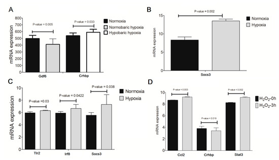 The expression levels of crucial genes (including Casp1, Ccl2, Cxcl10, Fas, Gbp6, Ifih1, Irf8, Socs3, Stat3, Tlr2, Syk and Crhbp) obtained after the above-integrated analyses were also validated in hypoxia/H2O2-induced retinal injury models. In line with NP exposure and ONC, Gbp6 and Crhbp were further confirmed to be lowly expressed (Figure 7A,D), while Socs3, Tlr2, Irf8, Ccl2 and Stat3 were highly expressed in hypoxia/H2O2-induced retinal injury models compared with controls (Figure 7B–D).