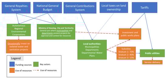 In the WSS sector, LG have various ways of procuring funding (Figure 2). The General Royalties System (GRS) and the National General Budget (NGB) are national funds for which the LGs compete. To access those resources, LG must submit project proposals to the MHCT, where a technical team approves or rejects the project based on compliance with technical, legal and land ordering requirements according to Res 330-2017 and Res 799-2021. Those projects are usually contested, and many are discarded for not complying with the requisites stated in the Res 661-2019, especially those formulated by weaker LG that lack the technical capacity to develop robust proposals []. On the other hand, the General Contributions System (GCS) allocates 5.4% of its resources for subsidies and investments in water and sanitation infrastructure. In Colombia, water and sanitation tariffs are cross-subsidised, wealthier households (Stratum 6-5-4) subsidise poorer households (Stratum 1-2-3). In poorer municipalities, where the tariff alone does not cover the subsidies of poorer households, LG support service providers with resources from the GCS. These resources are readily available for LG at their discretion. Additionally, LG can also generate resources on their own through municipal taxes. However, poorer municipalities usually depend solely on national resources as they do not have the capacity of raising taxes independently. During the 2014–2016 period, the National Planning Department (NPD) reported that the WSS’ financial distribution was: 43% GCS, 12% GRS, 10% NGB, 35% tariffs [], showing that the WSS is highly dependent on the GCS to fund its water and sanitation initiatives, making it a crucial financial source in implementing CWIS.