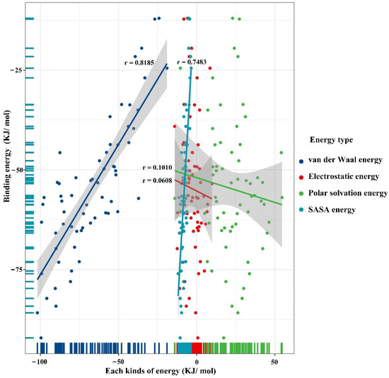 Figure 3 shows the 95% confidence interval in grey, with different colors representing distinct components: the bigger the correlation coefficient r, the stronger the association [47]. The correlation coefficients r of the linear regression equations between the change values of the combined free energy (the difference compared to the blank group No. 116–16) of the 64 combination schemes and van der Waals energy, non-polar solvation energy, polar solvation energy, and electrostatic energy, respectively, were 0.8185, 0.7483, 0.1010 and 0.0608 (rα = 0.2461, p = 0.05, n = 63, r > rα was significantly correlated). Furthermore, the change range of van der Waals energy is far wider than the jump range of non-polar solvation energy (SASA energy) under different additive combinations, both of which are negative, but the latter is smaller in absolute value. The solvation energy of the system is all positive, and its absolute value is larger than the absolute value of the SASA energy, indicating that the solvation effect is not conducive to the combination of the polystyrene 5 polymer and biodegrading enzymes, and the van der Waals energy is certain. Furthermore, there is a significant beneficial effect on the biodegradability of polystyrene 5 polymer. In addition, it has been found that the binding cavity of proteases is hydrophobic [47,48]. Moreover, combined with the factorial analysis results in Section 3.2, it can be found that the chemical structure of the additive with significant promoting effect mainly exhibits hydrophobic properties. Therefore, when the additive is used as an external stimulus, the additive will promote the further inward folding of the degraded protein, so that the binding of the degraded protein to the polystyrene pentamer is enhanced.