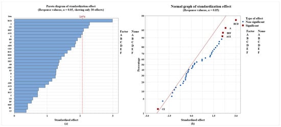 The findings of factorial analysis, when combined with Figure 1 and Figure 4, revealed that the effect of interaction between different additives on the biodegradation of the polystyrene 5 polymer was distinct. The absolute magnitude of the biodegradation standardization effect of the polystyrene 5 polymer is depicted in the Pareto diagram (Figure 4). (From the maximum to the minimum effect). It is statistically significant (α = 0.05) when the factor bar passes the reference line 2.074. As a result, the impact of additive A and its combination B*C*D, C*E, B*E*F, and A*C*E on the polystyrene 5 polymer’s biodegrading performance was statistically significant (Figure 4a), and the addition of B*C*D, A, B*E*F, and A*C*E has a substantial favorable effect. That is, it promotes the breakdown of the polystyrene 5 polymer (Figure 4b).