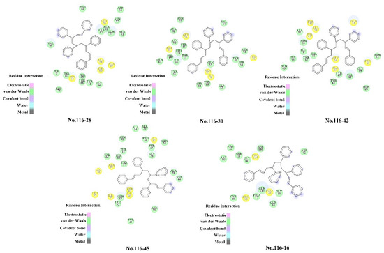The amino acid residues analysis of the interaction between the polystyrene 5 polymer and degradation enzyme 7CC4 is displayed in Figure 5 under the condition of an external addition with a clear favorable effect (where the green circle represented the amino acid residues involved in van der Waals interaction [49]).The number of amino acid residues around the polystyrene 5 polymer increased after adding external conditions conducive to polystyrene 5 degradation, indicating that van der Waals interaction was the main driving force for the binding of the polystyrene 5 polymer and degradation protein 7CC4. This conclusion follows the preceding one. Hydrogen bonds and hydrophobic interactions are critical in the binding of ligands to proteases, according to previous research [50]. Table 7 shows that in the absence of external additives (No. 116–16), only four hydrophobic interactions were formed between the polystyrene 5 polymer and degradation protein 7CC4, whereas a combination of external additives (No. 116–42, No. 116–28, No. 116–30, No. 116–45) formed seven, five, five and eight hydrophobic interactions, respectively, with only a small amount of hydrogen bonds, indicating that the more hydrophobic interactions formed, the more conducive to the combination of the polystyrene 5 polymer and degradation protein 7CC4. As a result, the reason the degradation effect of polystyrene 5 polymers is stronger in the group with favorable external conditions than in the No. 116–16 group may be because the former generated more hydrophobic contacts. Combined with the factorial analysis results in Section 3.2, the No. 116–45 group contains the plasticizer with the highest proportion of plastic additives, and the factorial result of this additive combination shows a significant positive effect; the polystyrene 5 polymer formed more hydrophobic interactions with the degradation protein 7CC4, compared to the other three positive effect groups. As a result, the No. 116–45 group was recommended as the best combination scheme for the biodegradation of polystyrene 5 polymers in the study.