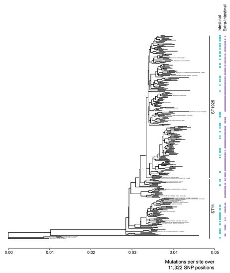 Chicago/Turabian StyleAung, Kyaw Thu, Wei Ching Khor, Kar Hui Ong, Wei Ling Tan, Zhi Ning Wong, Jia Quan Oh, Wai Kwan Wong, Brian Zi Yan Tan, Matthias Maiwald, Nancy Wen Sim Tee, and et al. 2022. "Characterisation of Salmonella Enteritidis ST11 and ST1925 Associated with Human Intestinal and Extra-Intestinal Infections in Singapore" International Journal of Environmental Research and Public Health 19, no. 9: 5671. https://doi.org/10.3390/ijerph19095671
