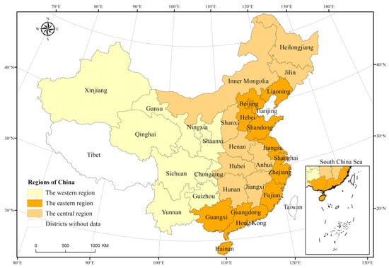 Battese (2004) [] was the first to propose the meanings of group-frontier and meta-frontier. Meta-frontier indicates the potential technical quality of decision-making units (DMUs). Group frontier refers to the actual technology level of different DMUs. The model analyzes the gap with the meta-frontier for grouped data, each of which has a different set of technologies referenced. According to the classification standard of the National Bureau of Statistics of China, China’s provincial administrative divisions were divided into three major clusters—East, Central, and West—to explore the efficiency of green development under the meta-frontier and group frontier, respectively (Figure 1). The division standard is reasonable.
