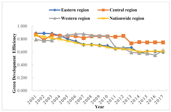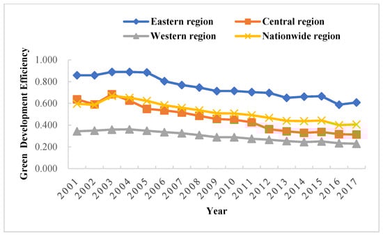 - China’s inter-provincial green development efficiency varied significantly under the group frontier and meta-frontier. Under the meta-frontier, the mean values of green development efficiency during 2001–2017 were eastern region > central region > western region, while under the group frontier, the mean values were central region > western region > eastern region. Based on the technological gap ratio, the eastern region was closer to the meta-frontier in terms of green development efficiency technology, while the western and central regions were far away from the meta-frontier. This shows that the green development efficiency is preferable under the group frontier. Moreover, it also indicates the rationality and necessity of analyzing according to the three major groups.