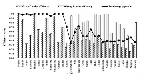 In summary, there were large differences in green development efficiency under the group frontier and meta-frontier in the eastern, central, and western regions. The underlying reason was the large technology gap in China’s 30 provinces relative to different technology frontiers, thus contributing to a large difference in the level of green development efficiency using technology. Only some provinces in each region corresponded to a mean value of 1 in green development efficiency. On the one hand, this is mainly because these areas are the pioneer areas of China’s reforms and opening up, with a high level of economic development and pay more attention to the rational allocation of resources and green development. On the other hand, the green development efficiency value in other provinces was mostly below 0.5 due to the excessive pursuit of economic benefits and the relative neglect of environmental and social benefits in the development process of these areas. The combination of these reasons leads to the difference in green efficiency in different regions. Hence, when considering development in the future, it would be necessary to take measures, such as improving all regions of China’s green development efficiency and resource allocation system and enhancing technological innovation.