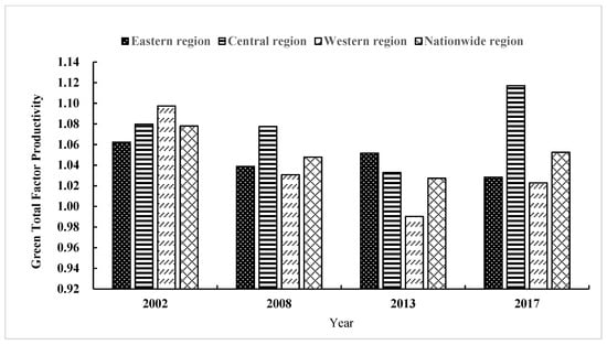 Table 3 and Figure 5 demonstrate the time distribution of GTFP and its changing trend in 2002, 2008, 2013, and 2017. GTFP has evident phase characteristics. The average value of GTFP was 1.043, indicating that under the environmental and energy constraints, GTFP has gradually increased. In addition, China has switched from an extensive and low-quality economic growth model to an intensive and efficient one. From the time-dimension perspective, GTFP displayed a decreasing trend from 2002 to 2013 and gradually increased and stabilized after 2013. From the regional analysis perspective, the three regions of China indicated significant differences. The western region remained consistent with the nationwide trend, showing a “downward–upward” trend. The overall development of GTFP in the eastern region was relatively stable, while GTFP in the central region displayed an upward trend. It was evident that the central region enhanced its GTFP by continuously improving innovation technology and science and technology.