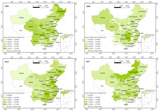 Figure 6 illustrates the spatial distribution of GTFP in China’s 30 provinces (municipalities and autonomous regions) in 2002, 2008, 2013, and 2017. Based on the empirical results, GTFP values were divided into four intervals and were proportional to color shades.