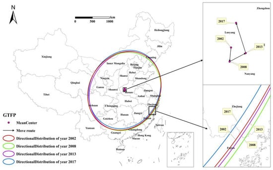 Based on GTFP calculated under the group frontier, the parameters related to the center of gravity-standard deviational ellipse and the spatial location transfer path of China’s inter-provincial GTFP during 2002–2017 were analyzed. The center of gravity of efficiency can reflect the spatial distribution of the intensive utilization of GTFP, while the standard deviational ellipse can reflect the spatial dispersion degree of GTFP distribution.