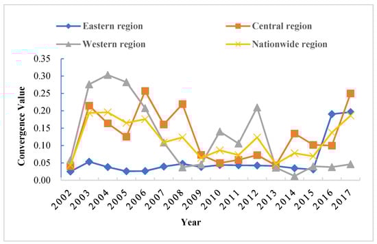 Hausman test was conducted to determine the specific model and the overall significance of the fitted regression equation. The absolute β convergence of inter-provincial GTFP in China are shown in Table 7. The fixed-effects model was used to determine the overall significance of the regression equation for the nationwide and eastern regions, while the stochastic model was used to determine the overall significance of the regression equation for the central and western regions. The corresponding β values were negative for all regions, indicating that the absolute β convergence existed at the same level for all regions in terms of GTFP growth rate. The results revealed that the provinces across the country grew relatively synchronously with respect to GTFP, with internal differences gradually disappearing as time advanced. From a regional perspective, the estimated coefficients of all three regions were negative and significant, indicating that the gap in GTFP growth within the same region was gradually narrowing and that provinces within each region can achieve relatively synchronized development in GTFP. Club convergence existed in the western region due to the simultaneous presence of σ convergence.