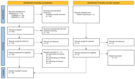 We identified 114 records from databases. After duplicate record removing, we screened titles and abstracts of 65 papers. After title and abstract screening, we assessed 32 studies for eligibility. Among these, 11 were excluded, since they did not meet our inclusion criteria. Moreover, 3 eligible studies were obtained from citation searching. Consequently, 24 relevant papers (12 on healthy subjects; 5 on subjects exposed to EE before the damage; 7 on subjects exposed to EE after the damage) that met the inclusion criteria were considered for the present review. Figure 1 shows a detailed flow-diagram of the literature search conducted in accordance to the Preferred Reporting Items for Systematic Reviews and Meta-Analyses (PRISMA) recommendations [].