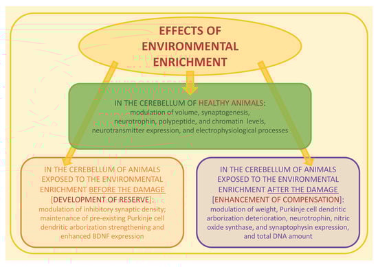 In this framework, the present review specifically aims to collect and synthesize the evidence provided by animal models on the EE effects on cerebellar structure and function by taking into account the studies on healthy subjects and on animals exposed to EE both before and after damage involving cerebellar functionality.