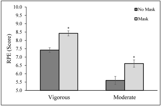 Ratings of Perceived Extension (RPE, scored on a scale of 1–10) during moderate and vigorous exercise with and without a mask. * p < 0.001 when comparing exercising with no mask on to exercising with a mask on.