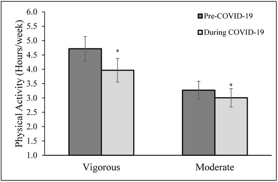 Physical activity (moderate and vigorous) before and during COVID-19. * p < 0.05 when comparing pre-COVID-19 pandemic self-reported exercise with during the COVID-19 pandemic self-reported exercise.
