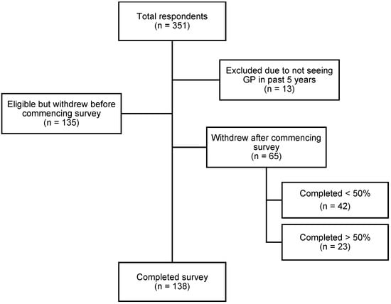 A total of 351 people responded to the advertisement and proceeded to the survey on Qualtrics. Of these, 138 completed the survey in full. Participants were advised non-completion of the survey would be interpreted as withdrawal of consent. As such, only complete responses were analysed. A flowchart demonstrating survey response rate can be seen in Figure 1. The median completion time for the survey was 26 min.