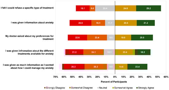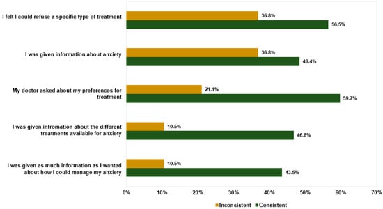In addition to the type of treatment offered by their GP, participants were asked to rate a series of statements about their GP’s approach to treatment at this first appointment. The results are presented in Figure 2. Similar proportions of participants agreed and disagreed that their doctor gave them information about anxiety (46.7% agreed vs. 41.6% disagreed), gave them treatment options (41.6% agreed vs. 45.3% disagreed), and asked about their preferences (44.5% agreed vs. 46.0% disagreed). When asked to rate whether they received enough information about how to manage anxiety, 38.0% of participants agreed and 52.6% disagreed, with the remainder being neutral. While most participants (54.0%) agreed that they felt able to refuse a specific treatment, more than one-fifth (22.7%) felt they could not refuse. Higher agreement was seen across all items for participants who were offered a treatment consistent with their preferences compared with those who were not (Figure 3).