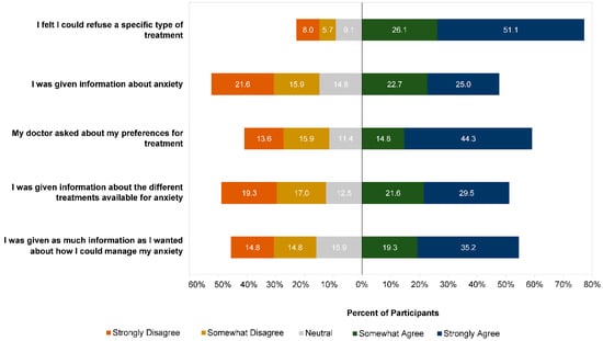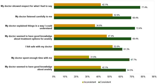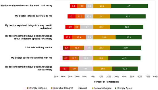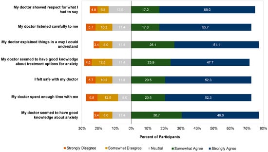 Participants reported generally positive experiences with their GP when they first sought help for anxiety (Figure 4). The highest agreement ratings were for the statement “my doctor showed respect for what I had to say” (70.3% agreed vs. 20.3% disagreed), and the lowest were for “my doctor seemed to have good knowledge about anxiety” (57.2% agreed vs. 23.2% disagreed).