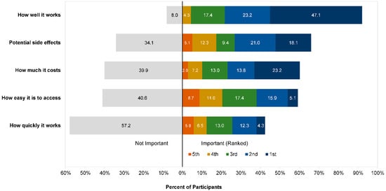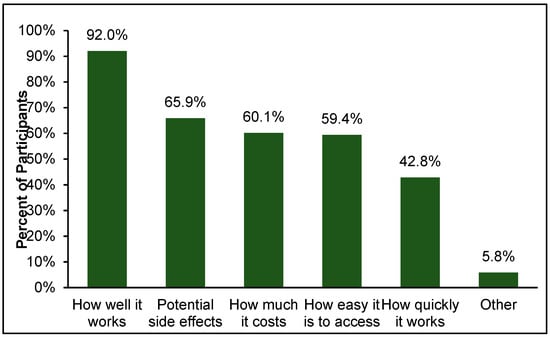 When asked about their priorities for anxiety treatment, consumers reported the most important consideration was effectiveness and were much less concerned with how quickly the treatment works. GPs often report perceptions that consumers expect medications for anxiety and have noted feeling pressure to provide “quick fix” treatments for mental health problems [,]. Our results suggest that this may be at odds with the preferences of consumers for anxiety. This may be particularly the case if the trade-off is long-term effectiveness, as in the case of benzodiazepines []. The majority of participants also reported potential side-effects as an important consideration in their treatment. This was echoed in qualitative findings, with several participants noting medication side-effects had been an issue with their treatment, and was a factor to consider in improving the care for anxiety. Adverse effects are a key reason consumers cease medication for mental health problems [,], and certain side-effects (e.g., sexual dysfunction) and their impact on quality of life are underemphasised in information provided to consumers [].