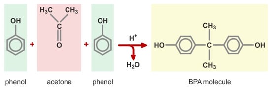 Bisphenol A (BPA, dian, 2,2-di(4′-hydroxyphenyl)propane, diphenylolpropane) is an organic compound that belongs to a group of phenols with the formula C15H16O2 and a molecular weight of 228.28. This compound was first obtained by Aleksander Dianin in 1891, during a reaction between acetone and two phenol molecules (Figure 1). The process is carried out with an excess of phenol in the presence of a catalyst—hydrochloric acid or an ion-exchange resin containing strong sulfonic acid groups (R-SO3H). Water is a by-product of this reaction [,,].